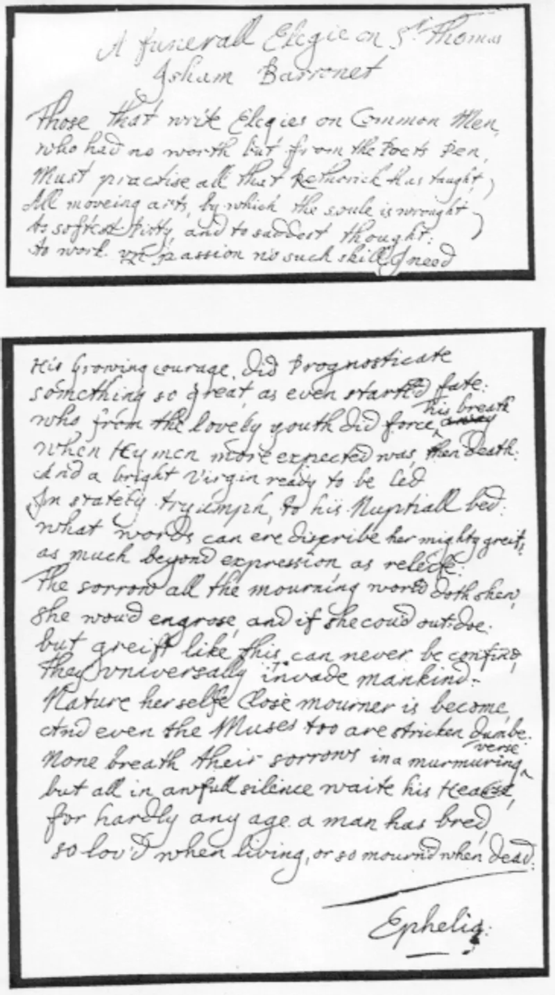 ______, “A funeral Elegie on Sr Thomas Isham Baronet.” (PwV 336. Two folios. Portland Collection, University of Nottingham Library. Subscribed “Ephelia”. With armorial watermark. As title suggests, written for reading at funeral ceremony, 9 August 1681.)