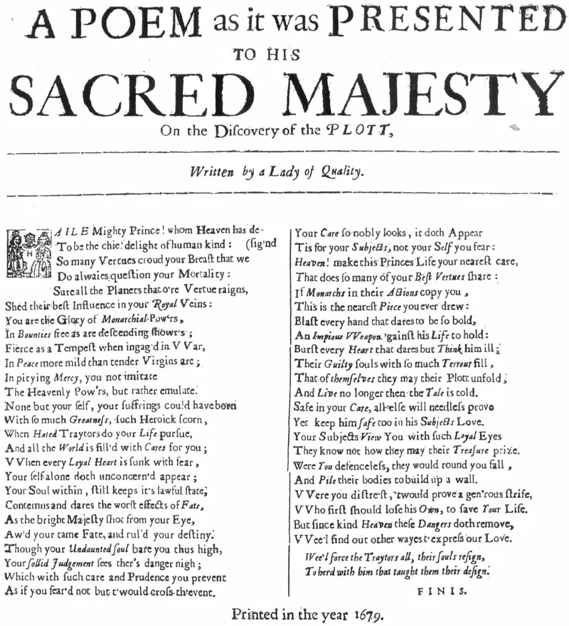 Ephelia, A Poem to His Sacred Majesty, On The Plot. Written by a Gentlewoman (Licensed brs.; London: Henry Brome, 1678).