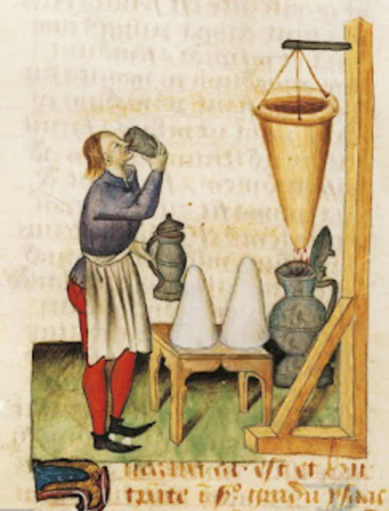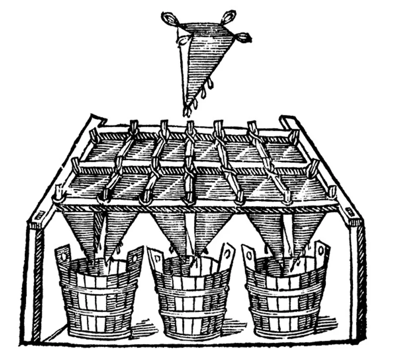 But Hippocrates didn’t actually invent the drink that bears his name. Rather, medieval Europeans named it after the “Hippocratic sleeve” (or “manicum Hippocraticum” in Latin) – a conical cloth filter supposedly invented by Hippocrates to purify liquids. In the Hippocratic tradition, wine could be used in lots of ways, including to nurse convalescents back to health. Medieval illustrations show apothecaries using these cloth filters to strain the spice-infused wine until clear, giving the drink both its name and its association with medical authority.